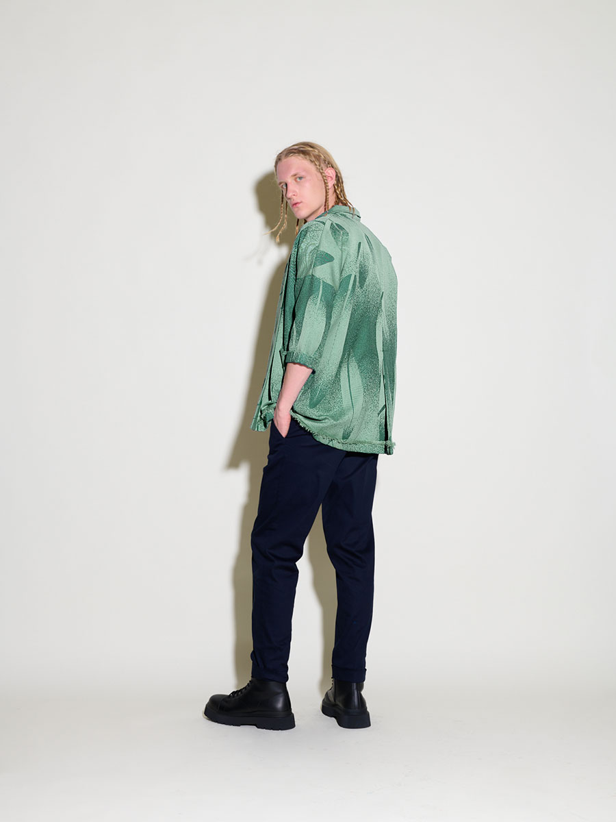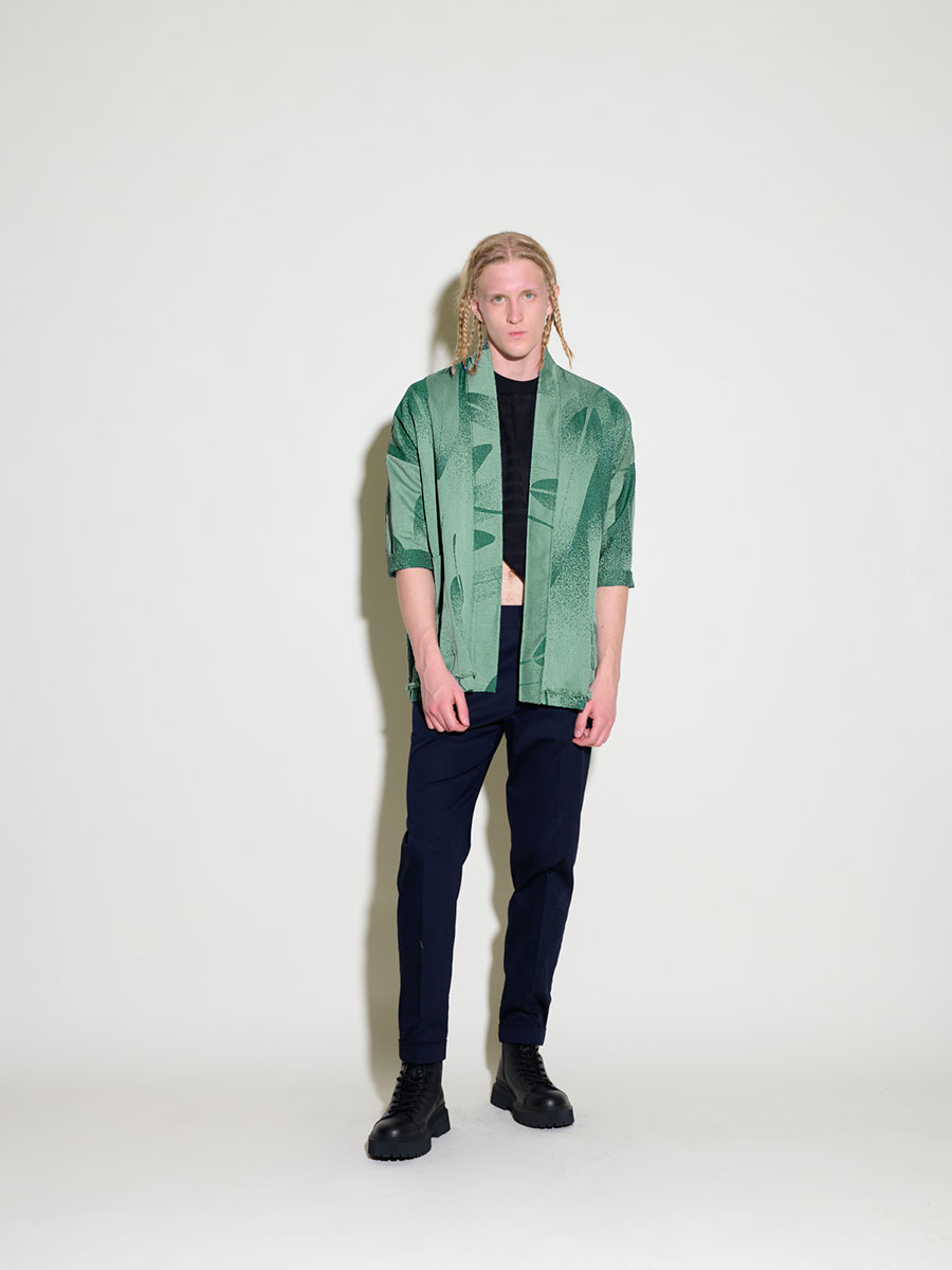 Náš tradičný strih svetríka so vzorom padajúcich pierok z kolekcie Nebá. Svetrík je bez zapínania a má dve veľké vrecká a je ozvláštnený detailom rázporku v zadnej časti a ozdobným ručne páraným spodným krajom. Je vyrobený z autorskej látky s oceľovo – mentolovou farebnosťou, oblaky sú oživené zaujímavou štruktúrou tvorenou gradientovými prechodmi vytkávaním nití. Látka bola vytvorená v limitovanej edícii 40 metrov.