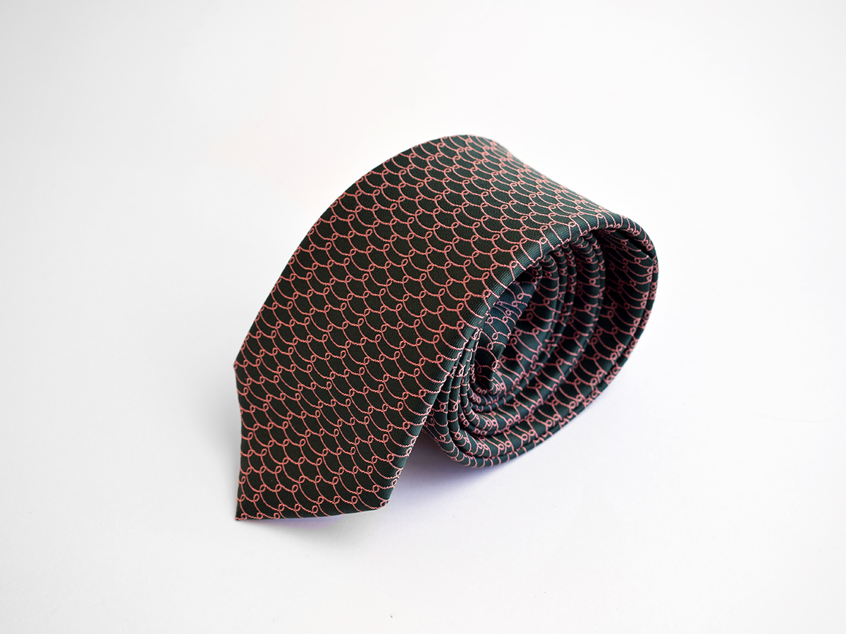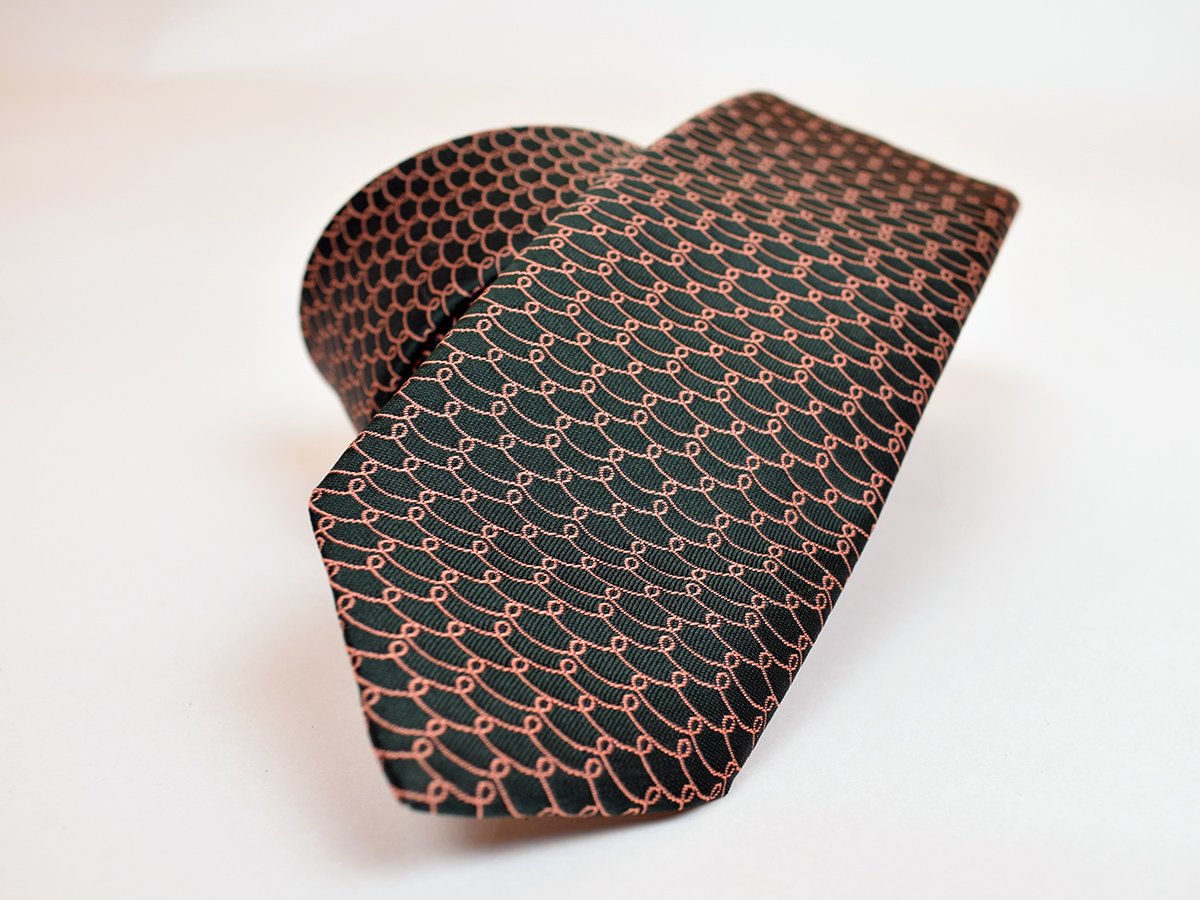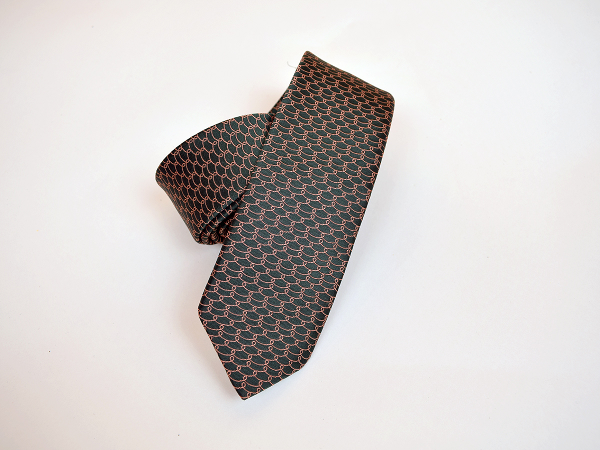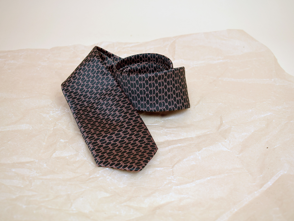 Viazanka inšpirovaná drotárstvom v zemitých farbách s jemnou vzorkou pripomínajúcou očká drôtikov pôsobí veľmi elegantne a decentne. Hodí sa na denné nosenie i na slávnostnejšie príležitosti. K viazanke si môžete dokúpiť motýlika s rovnakým vzorom.